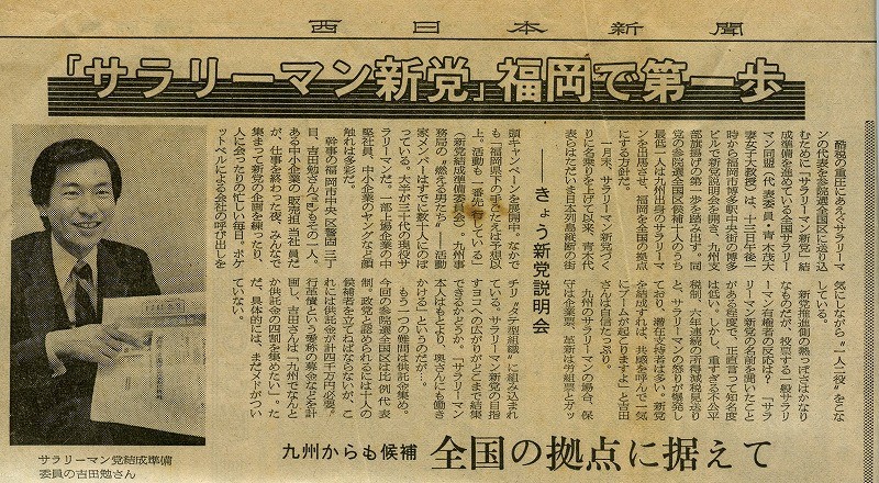 一昨日のことですが、妻が自分の実家(福岡)に帰った折、私のことが掲載されている昔の新聞記事(昭和58年)を持ち帰ってくれました。当時、私はサラリーマンであり、参議院選挙に導入される比例代表選挙に向け、「サラリーマン新党」旗揚げの運動に深くかかわっていました。九州の福岡は、その新しい政党結成の運動中心地の一つでした。