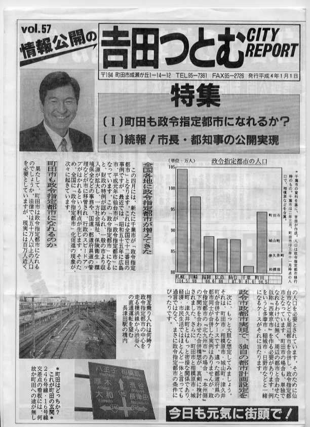 平成4年1月1日に発行した、吉田つとむCITYREPORTでは、町田市の合併対象は相模原市が適当と考えていました。