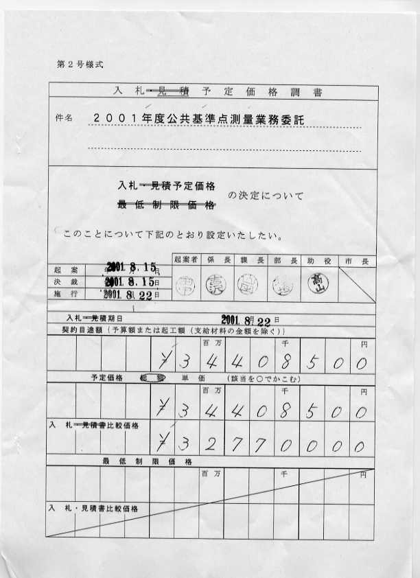 起案 2001.8.15 、決定 2001.8.15 、施行 2001.8.22 、入札期日 2001.8.22 、予定価格 \34,408,500