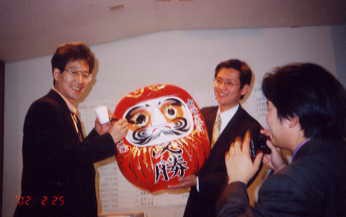 大野さんが、当選のダルマに眼を入れているところ。ダルマを持つのは、特別秘書の井筒さん。
