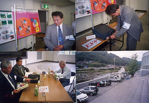 電子投票デモ機の前で、説明に大忙しの宮川竜一氏。新見市のホールの後ろには、TVカメラの中継車と新聞社の車両がずらり。メディア関係者の皆さんは、岡山からのハイヤー・タクシー組みが多い。特にTVカメラクルー。