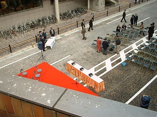 左側写真 クス玉がわれました。(デッキの下側の小さい七夕飾り状のもの。大掛かりなスイッチの割には、・・・・) 右側写真 午前10時30分が近まりました。ほんとうは午前11時スタート。担当部が、意図的に30分早く案内。