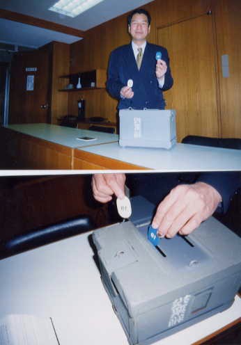 上の段の写真は白票(賛成)と、青票(反対)を示している(モデルは、吉田本人です)