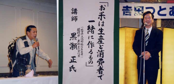 講演中の黒瀬正 氏、案内看板、懇親会で挨拶する吉田つとむ