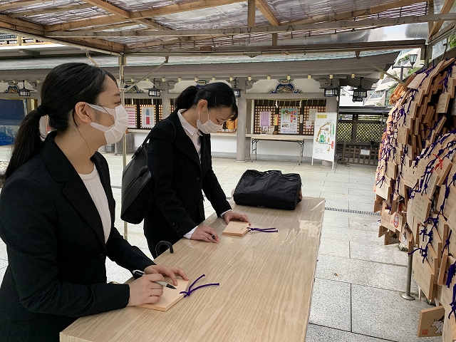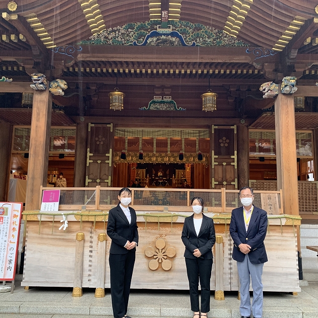 今期のインターン生4人は全員、湯島天神に参拝しました。難しい時期になっていますが、学業や就活が成就するように願っています。