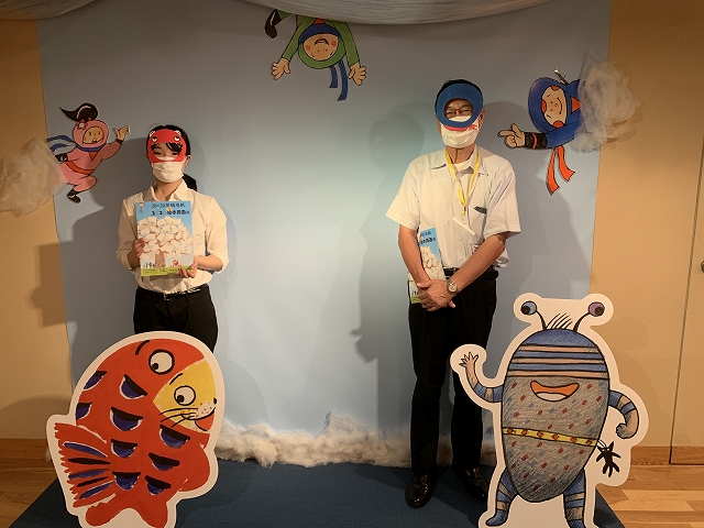 マスクにお面を貼り付け、展示ブースを見て回ろうという企画である。お面はそれぞれの作品に登場するキャラクターから選ぶことができる。お面をつけて、キャラクターのパネルと撮影できるブースがある。コロナ禍でもマスクを活用して絵本の世界を堪能できる工夫だ。