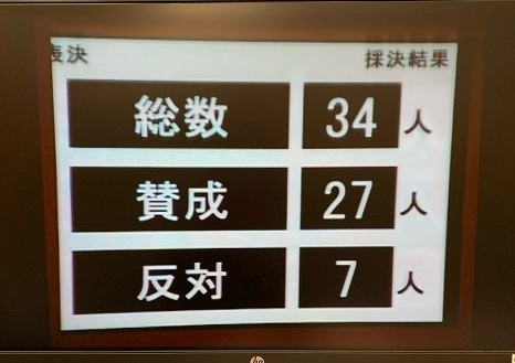 採決の結果は総数34人、賛成27人、反対7人で、可決となりました。