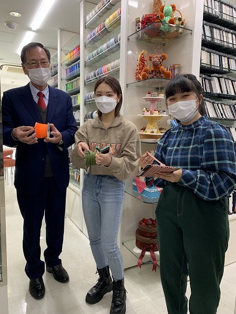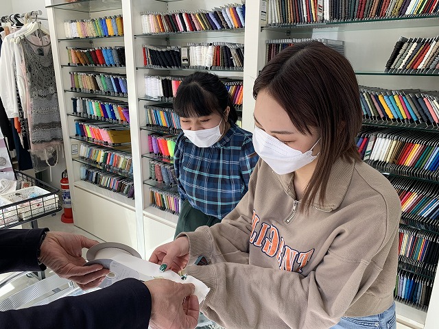 鎌田さんは主にこの二つの特徴がSHINDOの強みだと仰っていました。最近では、SDGsに関連したイベントにも参加しているそうです。お話を伺った後に、SHINDOで取り扱っているリボンを見せていただきました。普段私たちが見慣れているリボンから、ニット素材の柔らかく伸縮性のあるリボンや、端にプラスチックで加工されているリボンなど様々な種類のリボンがありました。私は、リボンというと服の飾りとして使われるサテンなどのリボンしかイメージができなかったのですが、編み方や素材を変え幅広い用途で使われていることを、SHINDOに行って学びました。私は、アパレルでバイトをしているのですが、一販売員としてリボンの大きな可能性について知ることができ、嬉しいとともに、よりファッションについて勉強したいと思いました。