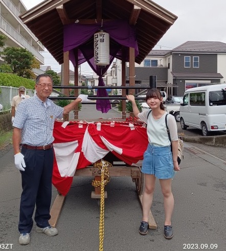 小川コープタウンの「月見祭り」に参加させて頂きました。雨で開催されるか分からない状態でしたが、午後にかけて晴れてゆき無事に夏祭りを行うことができました。私の地元では山車を引く文化がなく、初めての経験で面白かったです。子供たちが大声で頑張っているのを見て、自分たちも山車を頑張って引かないといけない気持ちになりました。
