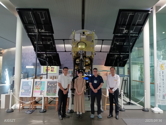 写真は、相模原市博物館のロビーに展示されている。JAXAの「はやぶさ2」の前で、学芸員の方と4人で写りました。