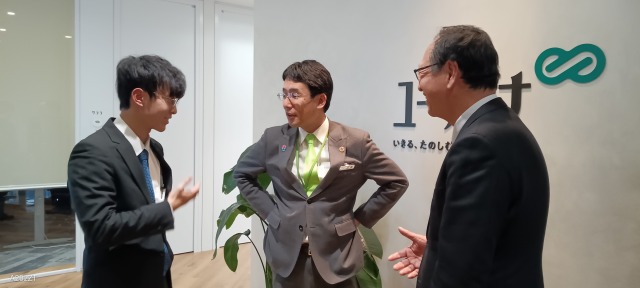 出雲社長は吉田議員のインターンシップの一期生であると同時に、私の中高大の先輩でもあり、非常に縁を感じております。当日もトレードマークの緑色のネクタイをつけられていたのが印象的でした。