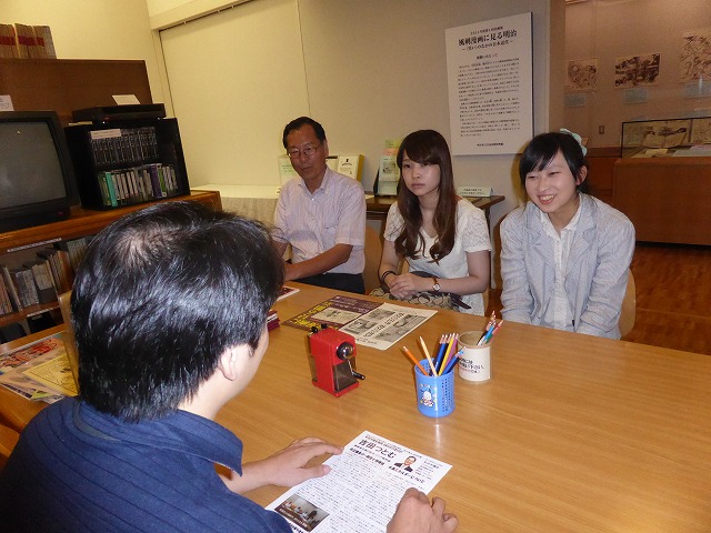 学芸員とは、主に博物館や美術館などに在籍し、史料や芸術作品などを保存し、一般に公開する仕事をしている方々です。しかし、学芸員になるには史料や芸術作品などのモノに対するその時々の対応のしかたや、モノから読み取れる歴史的背景や作者の訴えていることなどをしっかり把握できるほどの知識、一般の方にどうやって説明すれば分かりやすいか、どうすれば多くのお客さんが博物館や美術館などを訪れてくれるかなどを考えなくてはなりません。しかし、学芸員は現在では、なかなかすぐになれるような職業ではなく、なるまでにはたくさんの経験と実力と運が必要なのです。 まず、学芸員になるためにはどうしたらいいのかについて、学芸員になるためには勉強もとても大事なのですが、やはり、自分の専門分野に関する知識を深めた方がいいとおっしゃっておりました。自分の秀でた部分があれば、それは大きなアピールポイントになるだと言いました。しかし、そのためにはやはり大学院に進む必要があるともおっしゃっておりました。また、学芸員には自分の専門分野以外にも適する広い知識も持たなくてはなりませんが、それについては学芸員になってからでもできることだともおっしゃっておりました。 次に、学芸員の方が苦労しているところとその問題に対する対策についてですが、この資料館は建設されてからと現在とを比べると、予算が減額されており、そのためのやりくりにとても苦労するそうです。しかし、その中でも学芸員や職員の方たちとで知恵を出し合ったりしてうまく工面しているそうです。また、家族連れで来た方々のために、小さい子どもたちでも楽しめるように、塗り絵やパズルなどを作って楽しませているそうです。 今回の対談をとおして、学芸員の方たちの苦労と工夫、学芸員になるためのアドバイスなども聞かせてもらうことができました。学芸員になる為には努力と運も必要ですが、自分自身の専門分野を深めることも大事だということを改めて感じました。また、予算が削られて苦労するなかでも、様々な工夫をこらして、分かりやすく、また、たくさんの人々に来てもらう為の努力をしていることも深く感じました。今回の話を参考に、私も学芸員になる為に精一杯、努力していきたいと思いました。 |