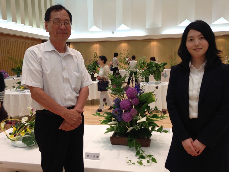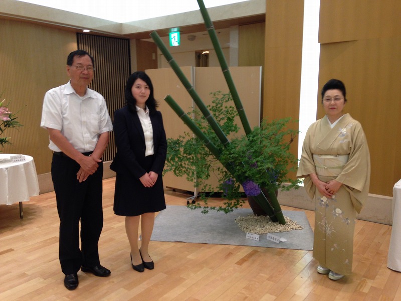 華道展は様々な流派の方の作品が一堂に会し、とても華やかな雰囲気の中、素敵な作品をいくつも拝見することができました。花の色も作品全体の形も様々で個性豊かな作品ばかりでした。梅雨の時期だからか、私が好きな花である紫陽花が随所で登場していて非常に楽しく拝見しました。