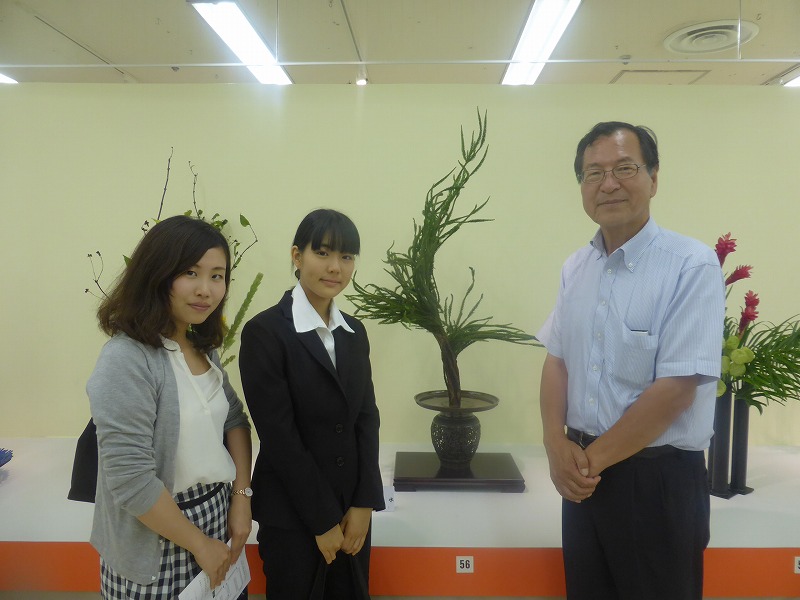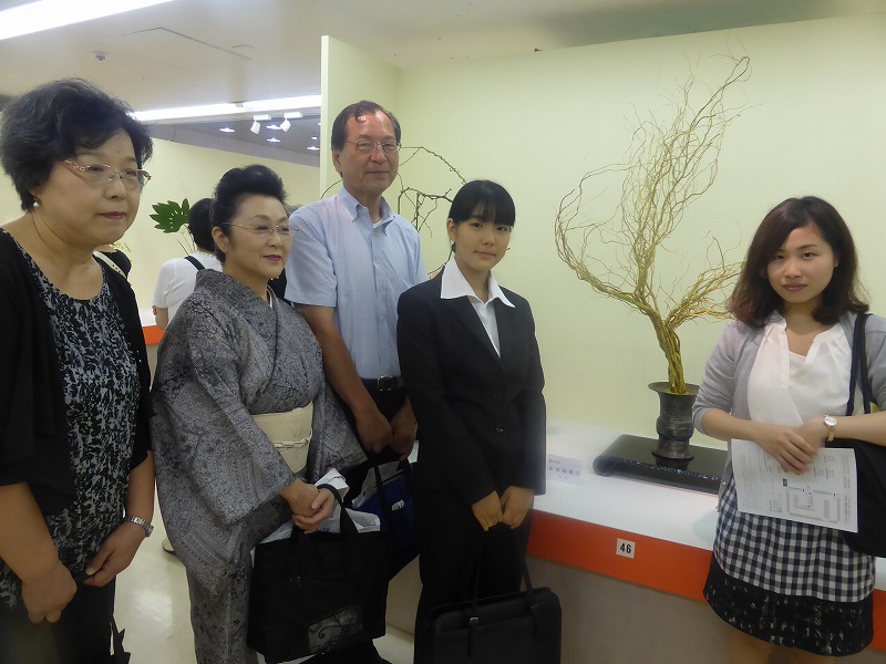 武者小路麻理さんは、始めて華道展を訪れました。自身では生け花はやったことが無いとのことでした。であればこそ、こうした展覧会も鑑賞した方が良かろうとの思いで、議会の仕事前にデパートの会場に立ち寄りました。デパートの開店と同時に入ったつもりでしたが、会場は後から後から人が入ってきて満杯になりました。数展の作品の前で記念写真を撮りました。