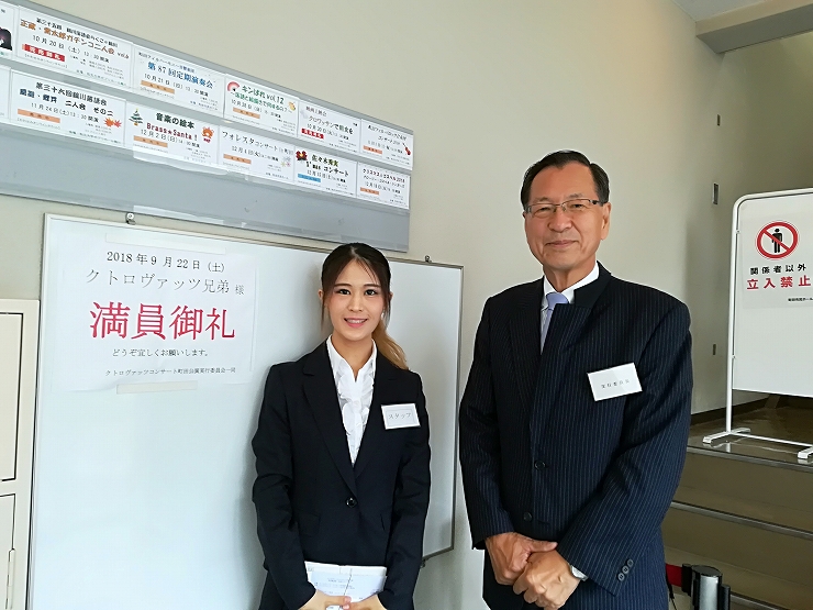 リズム良くしっかり一つ一つの音が聞こえ、感動しました。デュオは初めて聞きましたが、こんなにも調和する演奏が心に影響を与えるとは驚きでした。 私はプログラムの演奏が終了したあとに、クトロヴァッツ兄弟へ花束贈呈を行う係を担当しました。花束贈呈係は私を含め2人です。私は兄であるヨハネスさんに花束を渡す役でした。お客様の視線が集まる中、舞台の壇上に行くのは緊張しました。しかしまっすぐと前を向いて歩き進むことを意識したおかげか、ヨハネスさんの目を見て花束を渡すことができました。笑顔で顔を上げ、花束贈呈をすることができたので、終わったあと達成感がありました。 一年以上を費やし準備してきたクトロヴァッツコンサートが無事終了し、安心感と共に少し寂しい気持ちもあります。吉田さんのインターンは約1年と5ヶ月、活動してきました。そのインターン活動の中でも今回のコンサートというのは一番大きな行事でした。このコンサートを始めから終わりまで見届けることができ、本当に良かったと心から実感しています。また大切な役割を与えてくださった吉田さんに感謝しています。ありがとうございます。今日一日は私にとって、とても濃い思い出となりました。この経験を自分を成長させる糧にしていきたいと思います。 |