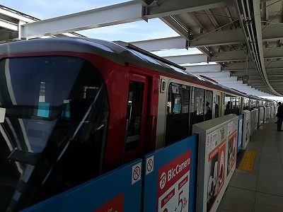 資料によれば、最高速度は時速80km、距離を所要時間で割った標定速度は空港快速で時速56km、各駅停車でも時速45kmあり、多摩都市モノレールの時速27kmと比べると大きな差があります。実際に乗車した際にも、併走する高速道路の車を追い越すほどのスピードで走っており、車両の揺れとともにそのスピード感を実感することができました。