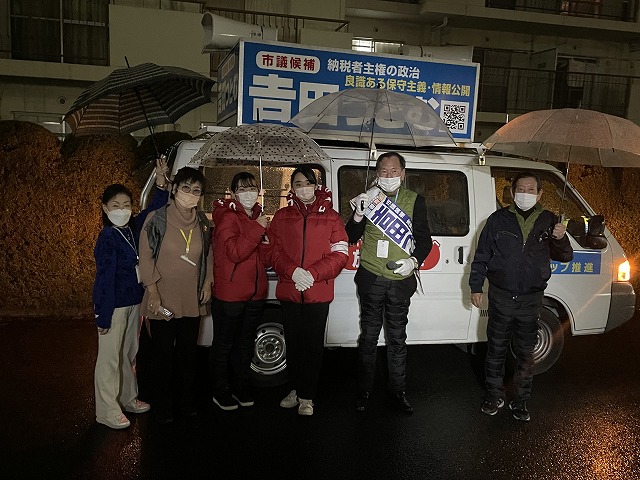2022年2月町田市議選最終日 選挙事務所前で午後8時遊説を終える。ささやかなマイク収め2022.2.19