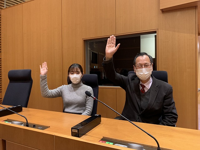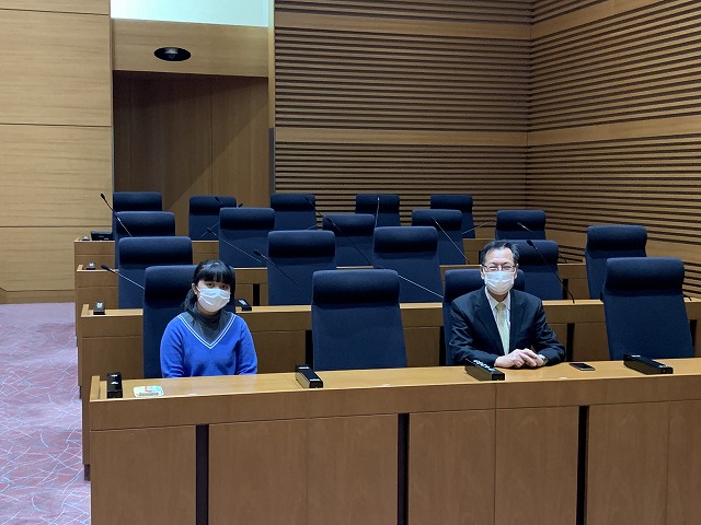 2022.2.24撮影 予定の議席に座りました 元インターン生の選挙スタッフと同席