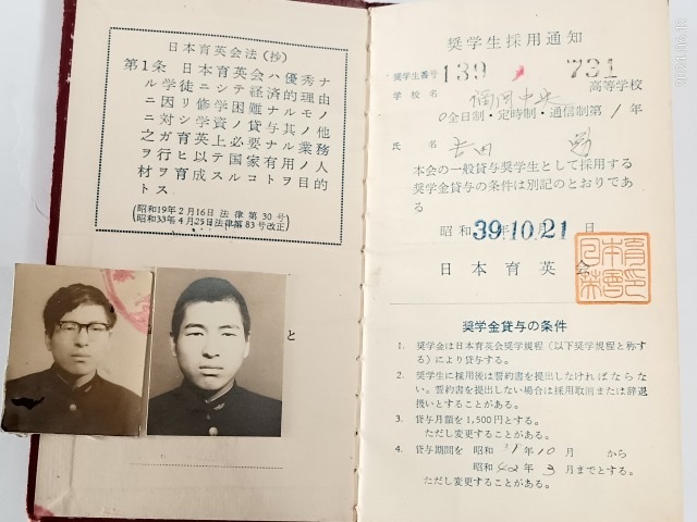 高校に入学して間もなく、参考者はもちろん、教材の一部も不足している姿に、一人の先生(数学担当:大賀先生)が気づき、数学の参考者を数種類渡してくれました。そうして、日本奨学会の奨学金をもらう(厳密には借りる)方法があることを教えてくれました。それから手続き書類を自分で書きあげ、学校の事務室に提出し、この時期の昭和39年10月21日に採用通知を受けたものです。