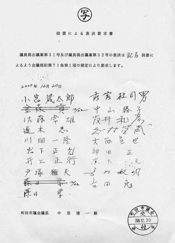 記名投票を求めた「投票による表決要求書」