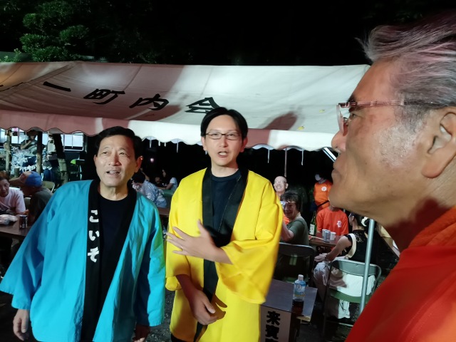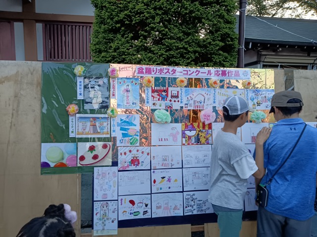 なお、盆踊り大会の構成は、鈴木会長のあいさつ、地元小学校の児童による花笠音頭、次いで、募集した盆踊り大会のポスター展の表彰がありました。入賞作品が展示され、その作者が表彰を櫓で行われました。次いで、盆踊り曲がスタートし、まず、ズンドコ節から始まりました。踊り手がすぐにはそろわず、私は最初の曲で櫓の舞台に上がり、指導の先生に従い踊ると、子どもたちが争うように、櫓に上がり、身動きが十分にはできないほどでした。その間に、市長の到着があり、櫓の上で挨拶が行わました。他に、政治家の来訪がありましたが、だれに限らず、紹介はありませんでした。小磯都議が村松市議(都議候補予定者)を伴い、会場を訪れ、トップの役員と挨拶を交わせていました。