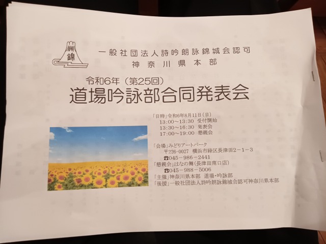 昨日は、みどりアートパーク(横浜市緑区長津田)で開催された一般社団法人詩吟朗詠会錦城会許可神奈川県本部が主催する、令和6年度(第25回)道場吟詠部合同発表会を全部鑑賞しました2024.08.12
