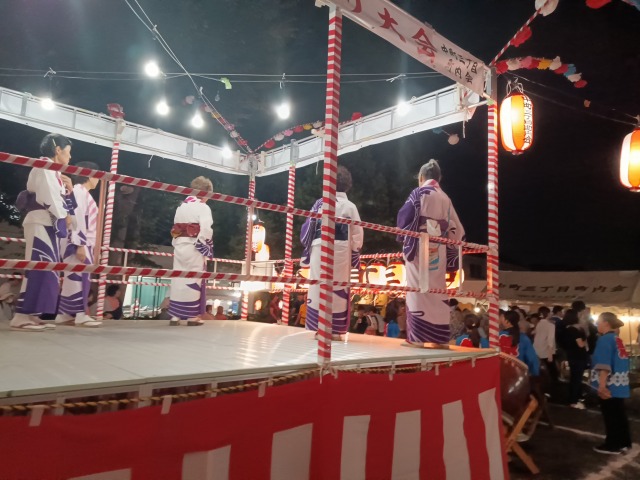 吉田つとむは、一人参加の踊り手ですが、途中で、有志参加者だけの踊り手として、難しめの曲パラダイス東京を含めて2曲を櫓舞台で踊りました。地域の皆さんだけでは色が限られるし、舞台の後には会館で休憩するのが通常であり、そうした色が付けられたのでしょう。森野3丁目でもそうした機会が設定される時があります。とにかく、吉田つとむは全曲踊りに専念しています。