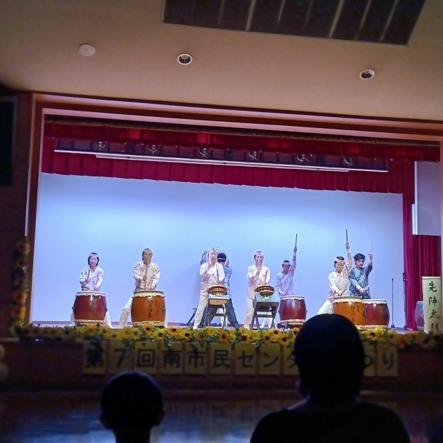 今日は以下の次第で駆け回りの日程でした。南市民センター祭りを見学し、ホールの和太鼓おりずるの演奏をまるまる1時間聞きました。本来は、青少年南第四地区委員会も動員がかかっていると思い、朝早くから出かけると、単に、行事案内を受けたに過ぎませんでした。せっかくですので、最初のプログラム=おりずるの和太鼓演奏を聞かせていただきました。大半女性のグループと思っていましたが、男性も加入されており、子どもや、関連グループも誕生しており、迫力ある太鼓演奏ができる集団になりました。おりずるは前から知っている人がリーダーを務めていました。
