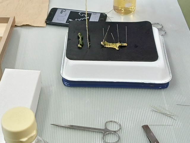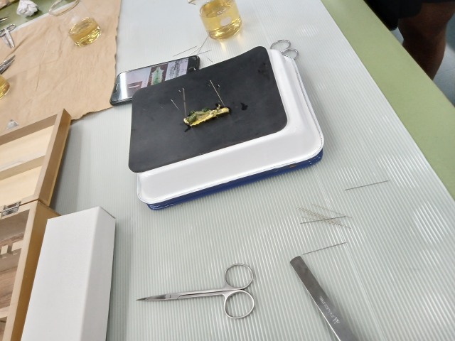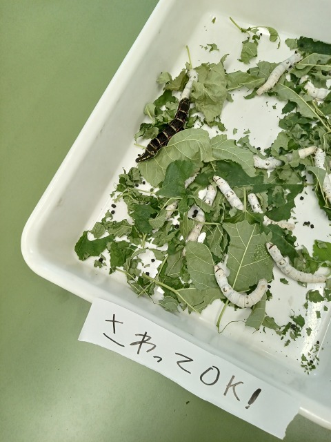 入り口の雰囲気で入ったのは生物部でした。なんと、さなぎの解剖をしていました。それも参加者に体験させるものでした。中学生や小学生の女子が体験しており、表皮を解剖してはがし、内臓と糸だし部分に分けていました。うーん、これは解体新書ではないかと言う発想が頭の中に浮かびました。以前にはなかったようで、顧問の先生に聞くと新しい赴任の方のようでした。隣のテーブルでは大きなお蚕さんを触らせていました。小学校の高学年生が表皮を優しくなぜていました。思うに、天皇家の女性は皇后様をはじめ、養蚕は伝統行事となっていますし、戦前のある時期は生糸の輸出額は日本の産品で第一位を占めていた時代があったとは誰も信じがたいことでしょう。