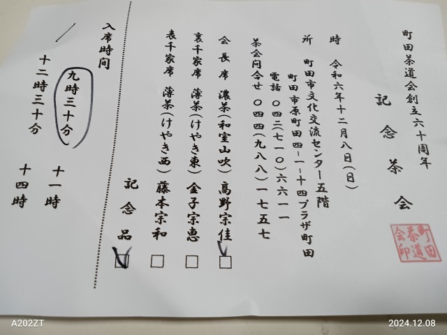 本日は町田茶道会の60周年お茶会、市長が正客、議長が次客。席が始まる直前、末席にいた私とは珍しく会話が成立20241208