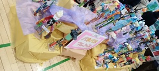 学年ごとに平面の絵画や立体の工作物が並べられており、コーナーに区切って作品が展示されていました。舞台には、六年生の作品ですが、裁縫のクッションが並んでいました。