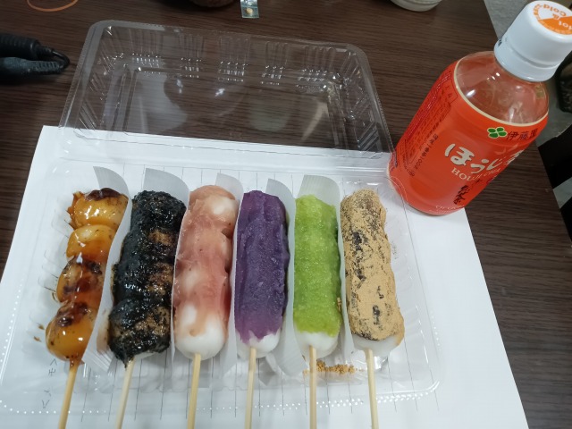 数日前の写真です。近所に出来た団子屋さんで6色団子を注文、お茶は駅立でいただいたもの2025.02.12