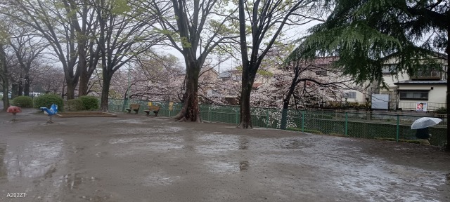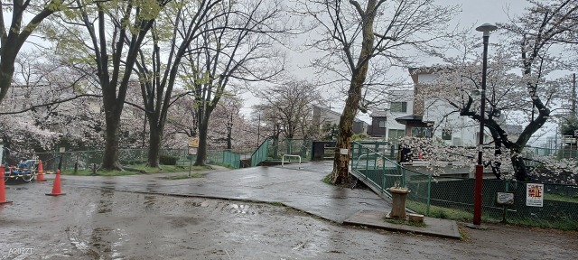 桜は満開です。雨で人の通りがほとんどありません。晴れておれば、この辺りは人であふれています。