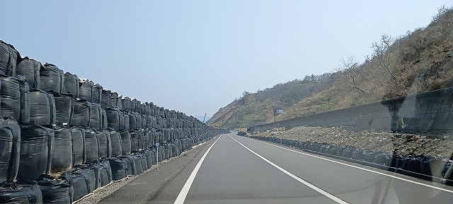 日本海沿いの道路が大きく改修中。道路の両サイドには耐候性のフレコンバックが無数に並ぶ。大手ゼネコンが工事に入る。この先は通行止めになる。国道249号線。この辺りは海面が数メートルも隆起した地域。この先に、「奥能登の揚げ浜式製塩」施設があり、この手前には、白米の千枚田がある。そこには、山間あいの別ルートで行ける。行った。