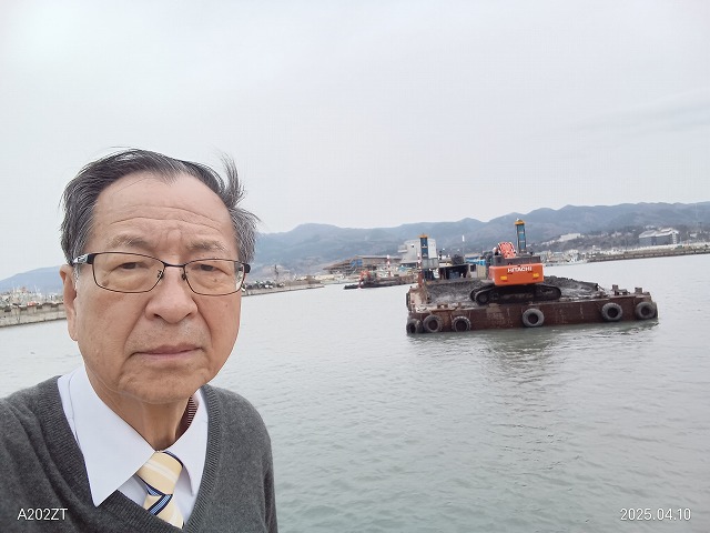2025年4月10日のことですが、輪島漁港の中に、浚渫船が何隻も出入りしています。話によれば、4月末には、漁港の機能が回復できるとのことでした。