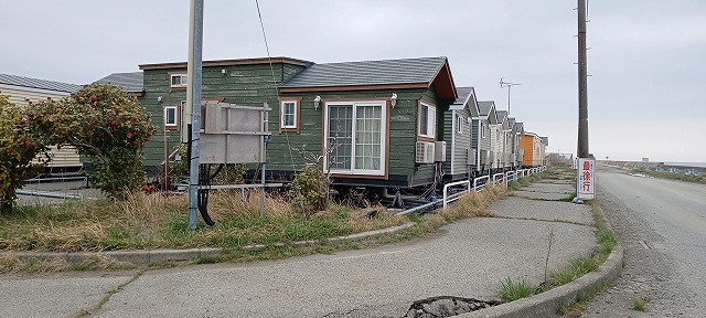 市街地から遠く離れた場所で見かけた仮設住宅。建物の確認はしていないが、一見して仮設住宅。この色でも恒久住宅とは違うだろう。