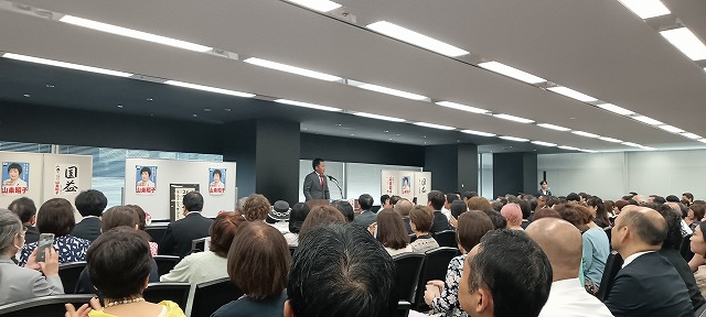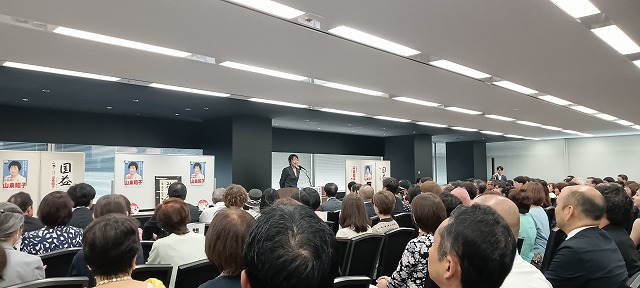 参議院選比例区に立候補した、山東昭子候補の本部事務所は港区新橋のビル1階に設置され、選挙事務所の看板が大きくかけられていました。通りからよく目立っていましたが、そのビル内で開かれた山東昭子候補の出陣式に参加しました。