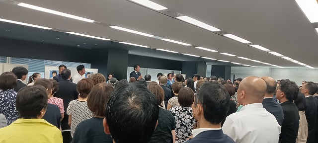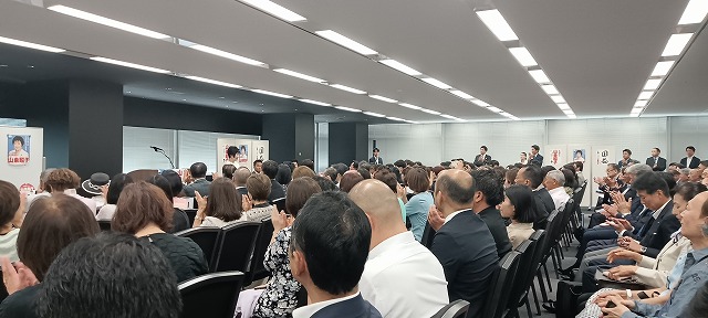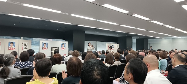 山東昭子候補の出陣式は、まず、会場に支援者らが集まり、山東昭子候補の入場で始まりました。そのビル内の出陣式はフロアーいっぱいに人が集まり、とても盛況でした。激励挨拶は、山東昭子議員の秘書出身の国会議員や市長、あるいは山東昭子参議院議員が擁立した国会議員によって進められました。これは、前回は二階俊博自民党幹事長を迎えた方式だったのですが、今回はまるで異なった、これまでの議員活動の集積として行われた選挙の様相でした。