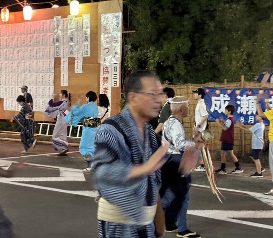 2025.08.02は、高ヶ坂第一町内会の盆踊り大会に開始前から閉会まで参加し、その後、速攻で成瀬夏まつり盆踊り大会に参加し、残り1時間弱の全曲を踊りました。