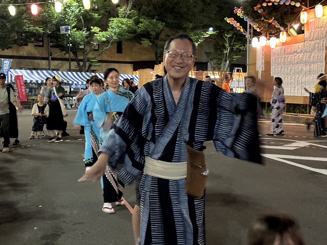 さて、話を戻して、成瀬夏まつり盆踊り大会の終盤には、以前に成瀬会館で盆踊りの練習をした方々と一緒に、櫓にも上がり、#成瀬においで,#ふるさと町田, などを踊りました。平常は、皆さんの輪に入って踊りましたが、盆踊りで各地に遠征するお仲間の皆さんと一緒に踊れたり、保育園児の時から知っている小学生とも並んで踊りました。また、外周の輪の中にある時は、本部席が見えるので、遠目に役員や世話役の方々に挨拶をしました。