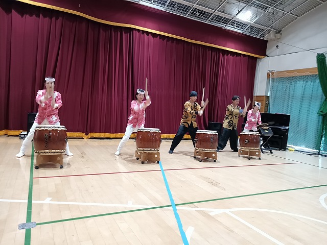 さて、太鼓が始まりました。和太鼓のグループで「おりづる」という団体でした。女性が主体の太鼓でしたが、今は男性も数人加わっていました。この子どもセンターの太鼓では、その男性も頑張っていました。また、子どもセンターの出演では、子どもの指導が行われました。幼児、小中学生が初めてばちを握っていました。