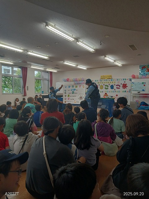 キャラクターのリッキーは遠目には人気がありましたが、小さな幼児にはそば目には苦手な様子もありました。園庭では、食べ物を出す模擬店や駐在さんのパトカー乗車体験も人気でした。