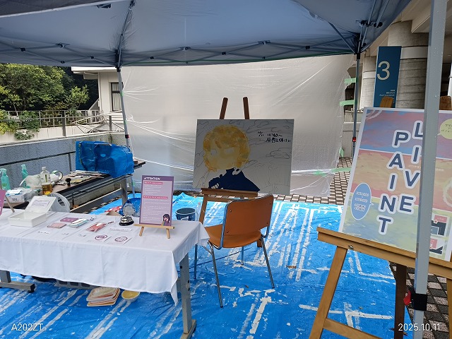 LIVEPINTでは、一人の学生が2日間で一作品を仕上げていました。さすが横浜美大、たった一人の学生に決まった空間を提供し、大学祭の場で専用の場にすることやっているわけです。こうした中から、画家が誕生できれば何よりのことではないでしょうか。