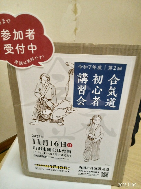 この日、11月16日の合気道初心者講習会の案内チラシが配られました。町田市立総合体育館第二武道場 11月16日(日)15:20-17:00入場無料の案内がありました。大勢の人に講習会に参加していただきたいと思います。