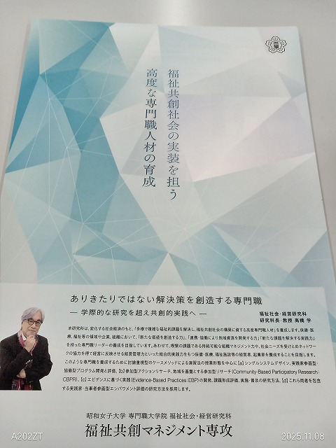記載事項は企画評価に重なる部分もありますが、社会人大学院の福祉共創マネジメント専攻の新分野では、展示と発表が行われていました。他の教室とは違って、教える側も学ぶ側も社会人、福祉の現場で働く学生の報告が行われていましたが、以下は、手元のメモを転載して、報告に変えます。「社会人大学院修了生共創カフェ 専門職大学院 共創ギルド 専用のオンラインサイトを作っているという。シティズン ピースフルスクールとは? 保育園教育の中で考える 年令によるわかる判断 トラブル対応 日本ではトラブル回避 譲る考え 思いやりと対話の取り組み」と言う趣旨の報告でした。その場の質疑応答がなく、会場とオンラインの2本建ての構成の会議方式でした。