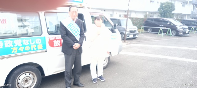 日程で言いますと、朝の駅立ちからスタートしました。約2時間半の立づくめのご挨拶です。午前8時からの選挙チラシの配布は、前日に選挙チラシが配布し終えたので、この日は終始ご挨拶でした。駅頭を見渡すと、派手に幟や顔看板を立てた陣営、党派の幟を立てるもの、複数個所で頑張っている陣営もありました。当方は、選管の街頭演説会用幟だけの構成ではみすぼらしく見えたでしょう。しかし、当方はベテラン、その仰々しく装飾品は控えるのみでした。