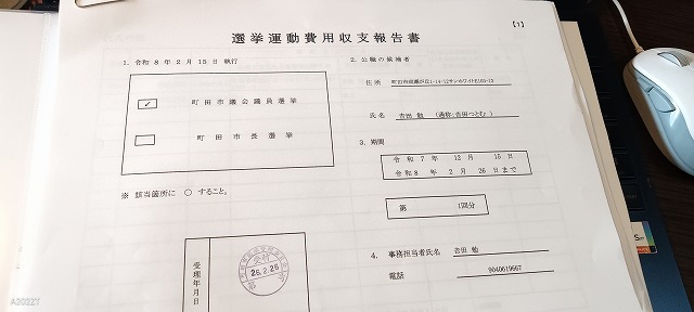 昨日は、15日に投票が行われた町田市議会議員選挙の収支報告書を作成し、提出にあたってその一部の修正を施し、町田市選挙管理委員会に提出を終えました。なお、必要書類として、銀行振り込みのため、領収書ではなく、振り込みの明細で支払いを行ったものに関して、必要な書類を作成中です2026.02.27