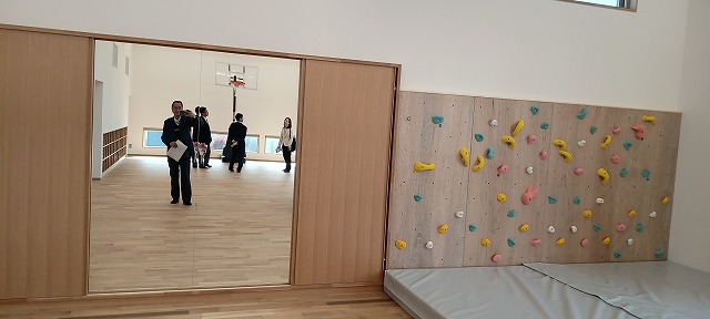 幼児用のスペースがあり、バスケットボールゴールもある多目的室はスライド式で開く大きな鏡を持っており、また、最近のはやりでボルダリングの壁面も用意されていました。低学年用の高さでした。