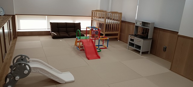 食事やおやつのもち込みで楽しい時間を過ごせ、飲料は自動販売機が設置されていました。限られたスペースに建てられてことで、壁面が直になっており、滑り台などが無い点が足りないところでした。